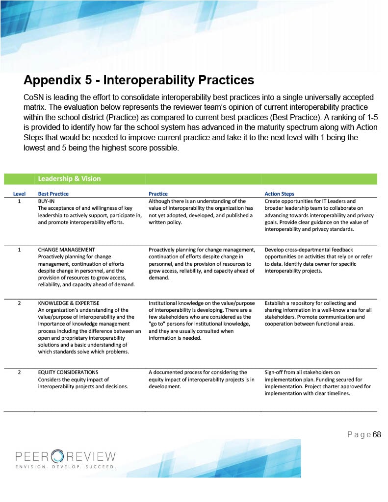 The effort needed to connect siloed systems is expensive and time-consuming. Interconnected systems directly translate to an improved data security posture for your school system. Included in the Peer Review is an interoperability analysis with actionable steps a school system might take to improve each component in the interoperability process.