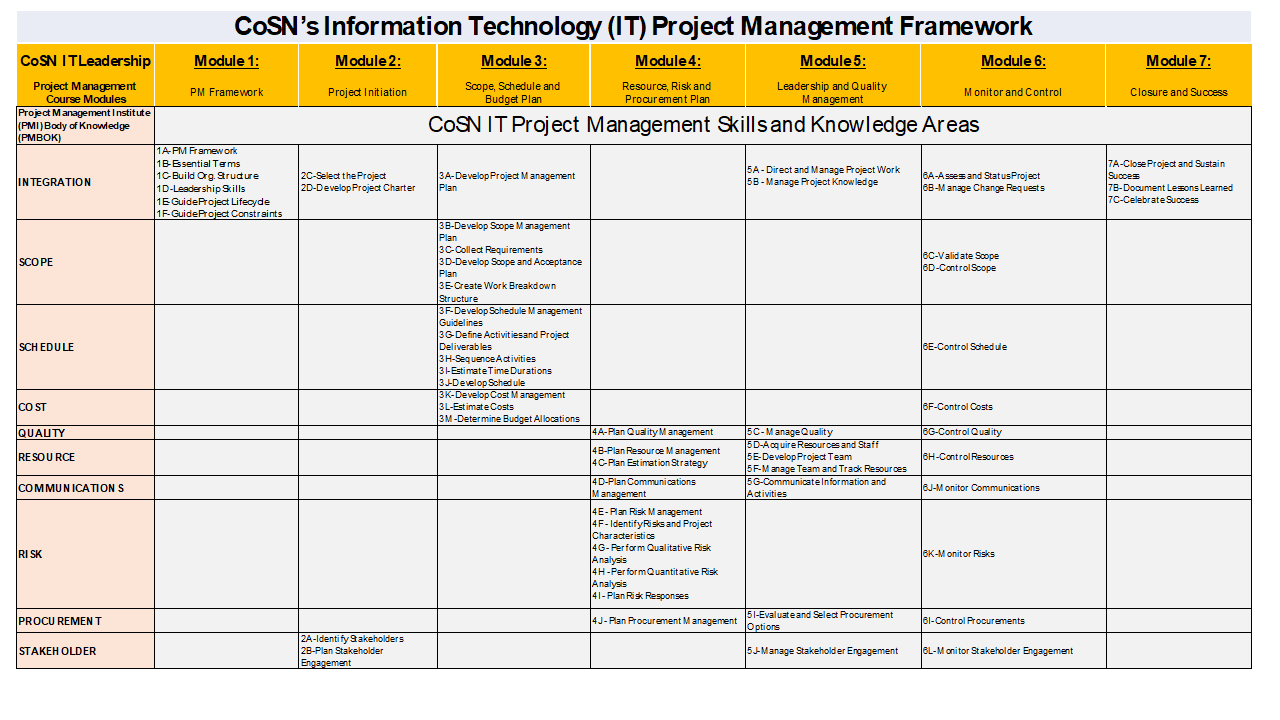 The IT Leadership Project Management Framework shows the 7 course modules, the 10 PMBOK knowledge areas, and the 59 skills and knowledge areas. Be patient with the material. The more you study and work with the course content, the easier it will be to understand the information and how to apply the content to school system technology projects.
